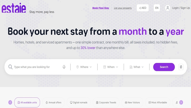 أعلنت منصة إستايestaie ، ومقرها دبي، أنها أول منصة عالمية للحجوزات طويلة الأمد قائمة على الذكاء الاصطناعي، حيث تقدم